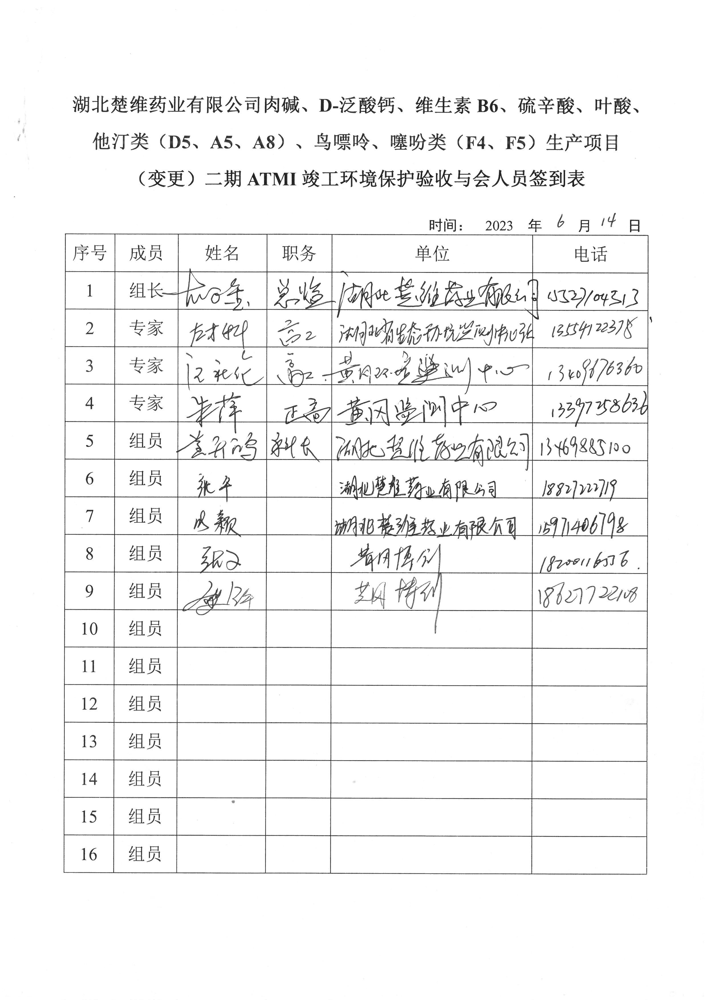 2023年6月14日,湖北楚維藥業(yè)有限公司在黃岡市主持召開了《湖北楚維藥業(yè)有限公司肉堿、D-泛酸鈣、維生素B6、硫辛酸、葉酸、他汀類(D5、A5、A8)、鳥嘌呤、噻吩類(F4、F5)生產(chǎn)項目(變更)二期ATMI竣工環(huán)境保護驗收監(jiān)測報告》技術評估會。