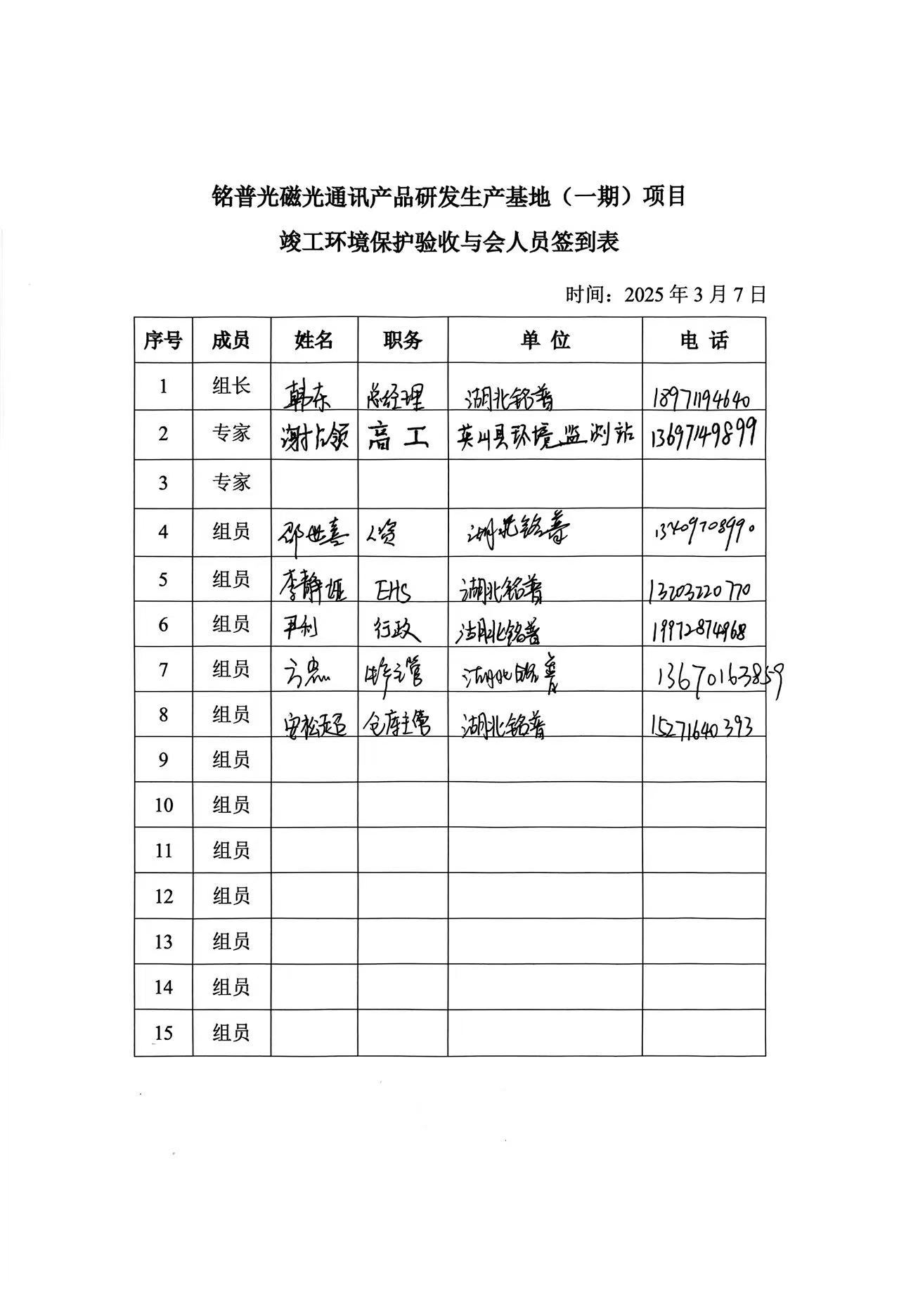 2025年3月7日,湖北銘普光通科技有限公司在黃岡市黃州區(qū)主持召開了《銘普光磁光通訊產(chǎn)品研發(fā)生產(chǎn)基地(一期)項目竣工環(huán)境保護(hù)驗收監(jiān)測報告表》技術(shù)評估會。根據(jù)《國務(wù)院關(guān)于修改<建設(shè)項目竣工環(huán)境保護(hù)管理條例>的決定》(國務(wù)院令第682號),以及環(huán)保部《關(guān)于發(fā)布<建設(shè)項目竣工環(huán)境保護(hù)驗收暫行辦法>的公告》(國環(huán)規(guī)環(huán)評[2017]4號),現(xiàn)依法將該項目驗收報告表及驗收意見等向社會予以公示,公示期為自本公示發(fā)布之日起20個工作日。公示內(nèi)容如下(具體詳見附件):