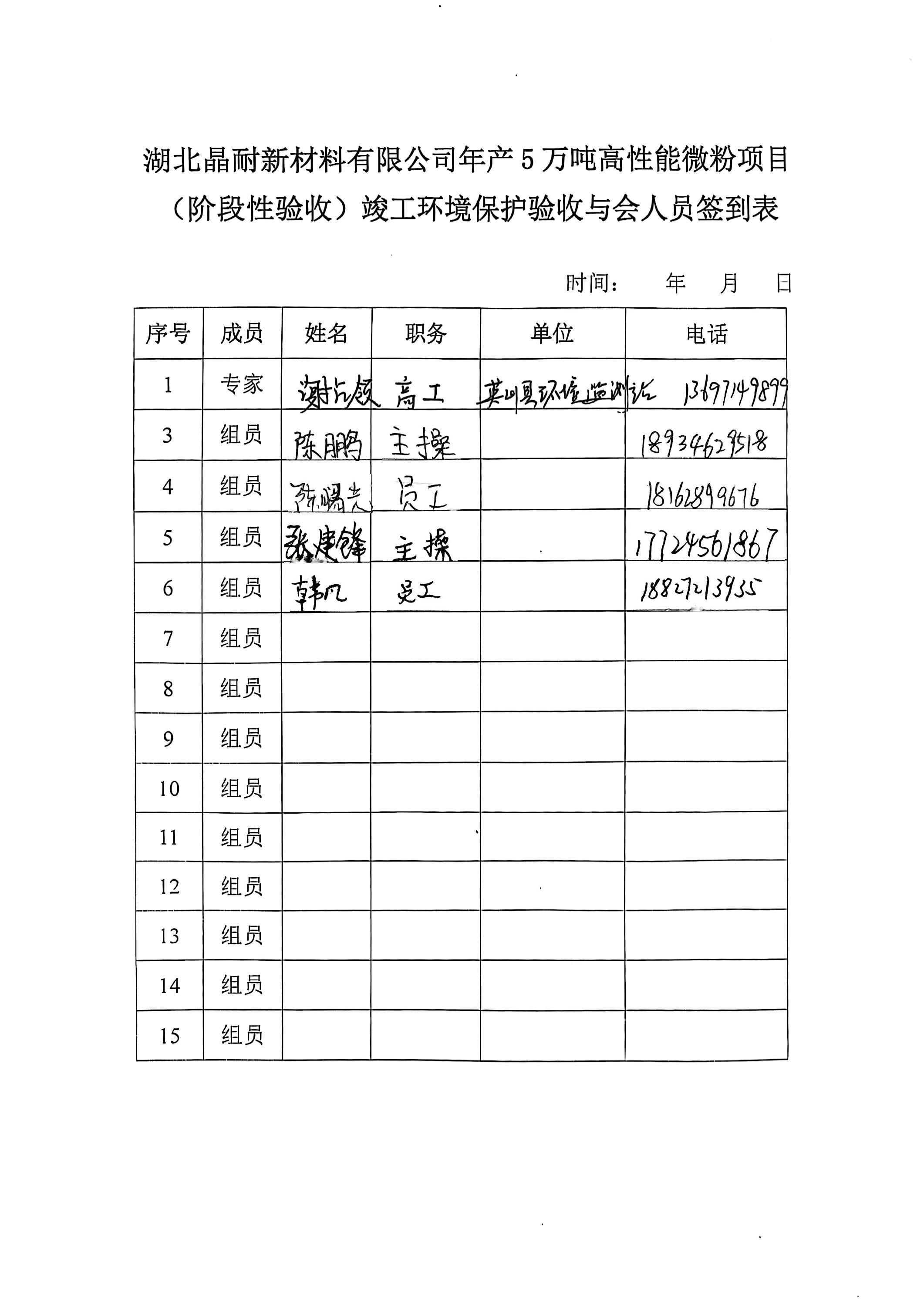 2025年4月19日,湖北晶耐新材料有限公司根據(jù)國家有關法律法規(guī)的要求,邀請1位專家負責對《湖北晶耐新材料有限公司年產5萬噸高性能微粉項目(階段性驗收)竣工環(huán)境保護驗收監(jiān)測表》內容術審查。